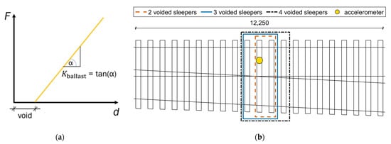 The decision to include a non-linear ballast support stiffness model accounting for sleeper voids was derived from observations of high magnitudes of the measured sleeper displacements (reconstructed from accelerations) together with the displacement patterns that could only be matched with non-linear ballast stiffness in the simulations. Previous field experience also showed a significant influence from sleeper voids on rail accelerations and displacements []. To allow for the MBS model to capture these phenomena, ballast stiffness bushing elements that account for voids between sleeper and ballast are introduced. Figure 8a shows the bi-linear bushing element function implemented for this purpose. Three sleeper void configurations are considered (see Figure 8b). The first case applies a void along the full length of two consecutive sleepers adjacent to the crossing transition. The second case applies the void along the full length of three consecutive crossing sleepers, while the third case applies the void for four consecutive crossing sleepers. This sleeper void model excludes the damping of the bushing element, as the used bushing element damping is defined by its velocity independent from the bushing displacement. Uniform support conditions are assumed along the length of each sleeper. This modeling simplification is observed in the form of addressing averaged track properties (homogenized).