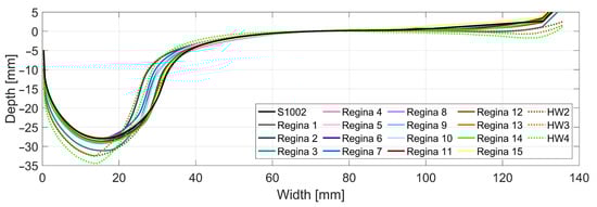Wheel profile set used in the MBS analysis. Nominal wheel profile S1002 is marked with black color and the scanned Regina passenger train wheel profiles are marked with continuous colored lines, while the three hollow-worn wheel profiles are marked with dashed lines.