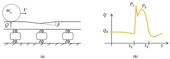 Farther up in the frequency spectrum is the dynamic excitation induced by the wheel–rail impact force during the crossing transition. Based on analytical modeling for a dipped joint [], this force impulse is expected to consist of two main components. The first component is the so-called force in the frequency interval 500–1000 Hz, which is due to the wheel and rail oscillating out of phase with a frequency that is related to their contact stiffness. The second component is the so-called force, which is related to the wheel and track oscillating in phase on the foundation stiffness (50–100 Hz). Figure 10a,b qualitatively illustrates the wheel trajectory caused by a dipped joint or crossing with dip angle β and the resulting time history of the wheel–rail contact force Q with the two force peaks. The and force peaks are proportional to β, which describes the directional change required by the wheel while rolling over the dip. This dependence can be found in [] or can be derived from the principle of linear momentum.