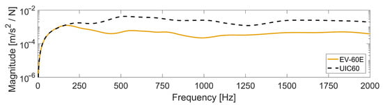 Crossing sleeper accelerance FRF (at sensor position) for the load applied on the crossing rail above the sleeper. Results are shown for two turnout designs, EV-60E, featuring rail fastenings with a soft resilient element between crossing rail and sleepers, and UIC60 with a direct and very stiff connection between crossing rail and sleepers. Nominal ballast parameters were used (see Table 4).
