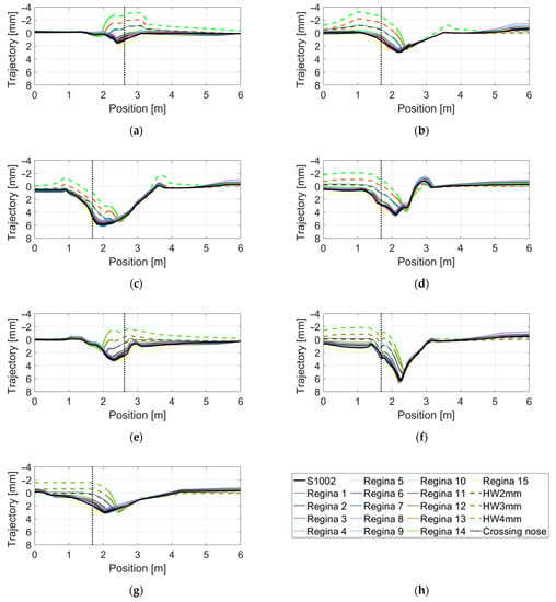 Calculated trajectories of relative vertical wheel–rail displacement for 19 different wheel profiles in seven different crossings: (a) HO 21B, (b) HO 22A, (c) SG 21A, (d) SG 21B, (e) VAD 102, (f) VAD 131, (g) Nominal crossing geometry, (h) wheel profile legend (vertical, dotted line is the tip of crossing nose).