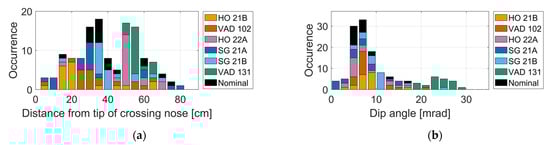 In Figure 13, stacked histograms are presented for two kinematic indicators of crossing geometry condition. Figure 13a shows the simulated longitudinal position of the wheel transition relative to the tip of the crossing nose. For crossing panel VAD 131, all transitions are gathered within a small region. In [], a so-called fatigue area criterion was established to characterize the state of the crossing geometry. The fatigue area is defined as the crossing nose region where most of the transitions occur. For a short fatigue area in the lengthwise direction of the track, the crossing transition impacts would be condensed, indicating a worn crossing geometry with larger dip angles.