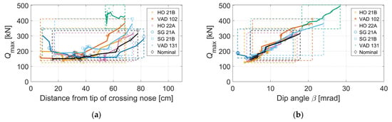 Overall, a large variation in Qmax is observed for the 19 different wheel profiles. This shows that neither the location of the impact transition nor the dip angle is uniquely defined for a particular crossing geometry. It has previously been shown that the structural loading and the following degradation rate of a particular crossing is strongly related to the Qmax during the transition [,]. Together, this emphasizes the need for simulations of true operational conditions to determine the state of a crossing panel. In addition, it is observed that there is no clear separation in results when simulating facing (HO 22A, SG 21A, SG 21B, VAD 131, Nominal) or trailing moves (HO 21B, VAD 102). The results in Figure 14a,b would be qualitatively the same if they were based on results from simulation case 2 with soft pads, but with lower force magnitudes.