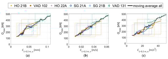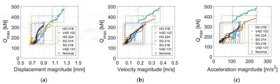 Correlation between Qmax and maximum (a) sleeper displacement, (b) sleeper velocity, (c) sleeper acceleration. Results are from simulations with 19 different wheel profiles, seven crossing panels, and a train speed of 160 km/h. Wheel–rail contact forces and accelerations are low-pass-filtered at 250 Hz. For interpretation of the details, see the caption of Figure 14.