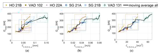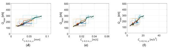 Relation between simulated Qmax and for six different crossing panels (nominal parameters, stiff (a–c) and soft (d–f) rail to sleeper connection). The black, continuous line presents a 7-points moving average filter through the cloud of all scatter points. Dashed boxes (with the corresponding color) cover the min-max domain of results for each crossing panel.