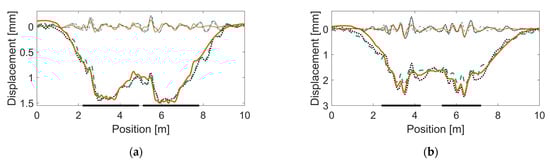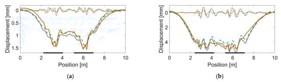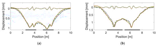 Calibration results showing measured and simulated sleeper displacements for an individual bogie passage in crossing panels (a) SG 21A (facing move: three voided sleepers) and (b) SG 21B (facing move: three voided sleepers). See also the caption of Figure 17.