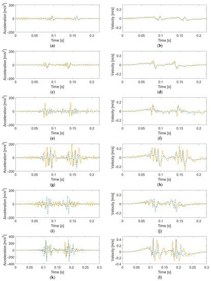 Examples of simulated (dashed line) and measured (continuous line) sleeper acceleration and velocity responses: (a,b) HO 21B, (c,d) HO 22A, (e,f) SG 21A, (g,h) SG 21B, (i,j) VAD 102, (k,l) VAD 131. Note different scale for VAD 131. Train speeds are 160 km/h for HO 21B, SG 21A, and SG 21B; 190 km/h for HO 22A, VAD 102; and 130 km/h for VAD 131.