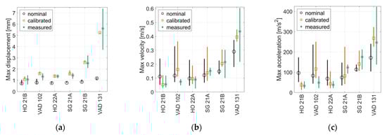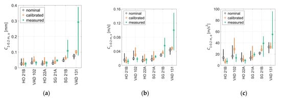 Comparison between maximum measured and simulated sleeper responses (mean value marker, full range vertical line) for (a) displacement, (b) velocity, and (c) acceleration. Simulated results with either nominal (o-black) or calibrated track model parameters (□-orange); train speed 160 km/h for HO 21B, SG 21A, and SG 21B; 190 km/h for HO 22A, VAD 102; and 130 km/h for VAD 131; and 19 different wheel profiles. Measured results from 20 signals (*-green) recorded at similar train speeds as in the simulations. Data are low-pass-filtered at 250 Hz.