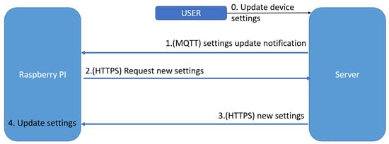 In Figure 6, is presented the flow of updating the settings of a device. The process is initiated by the user who updates the configurations on the website. We want to have a real-time update of the device so the speed is the key in this flow as in all the others.