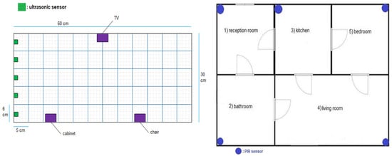 The room sequence can be obtained using one PIR sensor in each room. The person’s location inside the room can be determined using an array from the ultrasonic sensors inside the room, as shown in Figure 5 and Figure 6.