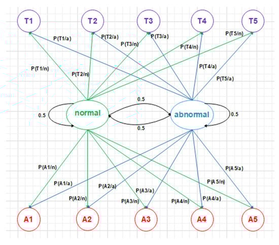 There are different ways to extract features from the sequence of sensor data concerning an individual. Many features can be extracted from the sensors, such as room ID, sequence of rooms visited, time spent in each room, repetition of room visiting sequence, location of the individual within the room, and speed of individual’s movement []. (1) Baseline method: When the sensor data window is defined, the window can be transformed into a feature vector. The sensor-based windowing method suffers from problems such as the possibility of the window containing sensor data widely separated in time. These issues can be avoided using a time-based weighting scheme that considers the relative difference in each sensor’s triggering. (2) Sensor dependency method []: Sometimes, features from the data of the sensor will make some expectation to the next sensor data. For example, if the person exists in the bedroom in the morning, the next activity is often going to the bathroom. In addition, dependence between sensors is defined as the chance of occurring two sensor events consecutively in the same window. This approach is known as Sensor Window Mutual Information (SWMI) for future reference. (3) Sensor dependency extension method []: Mutual information of two sensors depends on the order of the pair of sensors in the entire data stream. To perform a particular activity in a specific room, a person might have different route options. For example, in the prototype, the person can get to a room using five different paths: . The most widely used machine learning algorithms for detecting human motion patterns are the Naive Bayes and neural networks []. In the training phase, a set of motion pattern (training data) with labels (movement of the homeowner (normal) or the motions of the intruder (abnormal)) are used to estimate a particular model. The unknown motion data (test data) will be pre-processed and classified to the best model, in the Naive Bayes case, the conditional probabilities of the features and observations are then estimated to estimate the maximum likelihood as shown in Figure 7. Arduino Mega connected to the PIR sensors and interfaced to a PC with Intel core 7 CPU and 4 GB RAMs have been used to collect the data. MATLAB installed over the PC for pre-processing and for CNN training purposes. Finally, we used a simple buzzer connected to Arduino Mega that is interfaced to a PC. The classification mechanism implemented in the PC and the outcome (NORMAL or ABNORMAL) is decided and finally, if ABNORMAL, a trigger signal is sent to Arduino MEGA to activate a buzzer sound.