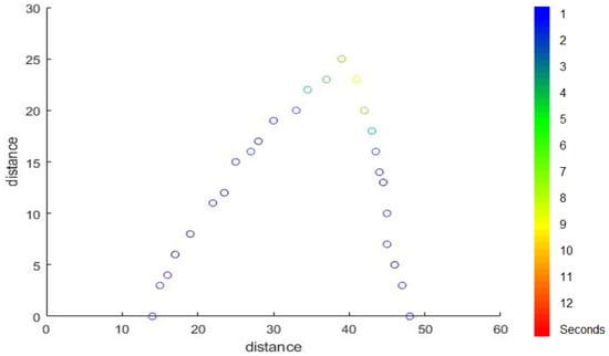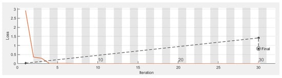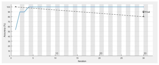 Figure 9 shows the walking paths obtained using the experimental prototype for different scenarios from different patterns of walking paths for normal and abnormal motion to be evaluated using CNN along with detection accuracy for each pattern. Using TensorFlow, it can be seen that the detection accuracy of the CNN following the training phase is accurate enough as shown in Figure 10, and this is also reflected in the loss rate shown in Figure 11; the training phase lasted for 30 iterations until it converges for a stable low enough loss rate and accuracy rate.