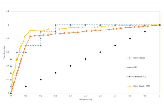To compare the performance of the aforementioned algorithms (Naive Bayes, CNN) and to have an insight into the performance of the combined algorithm (Naive Bayes + CNN). ROC curves are plotted in Figure 17. The reference ROC is used to tell if the algorithm is able to discriminate between classes or not, as long as the ROC curves exceed this threshold, it can classify successfully (with certain accuracy). To better understand the performance, we estimate the Area under Curve (AUC) for each algorithm and compare it against other AUC values presented in the related study section. The AUC values is shown in Table 1. The combined CNN and Naive Bayes outperforms the other algorithms for the setup we have in the experiment.