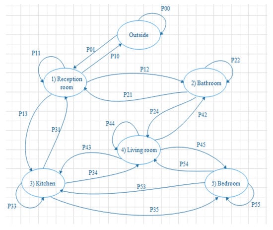 Furthermore, another dimension represents the total number of self-transitions in a room during a specific interval. This dimension is called the intra-room activity (). This dimension computes the total number of the received observations in a room during a particular interval and illustrates how the person is active in every room. The following equation calculates the dimension []:
