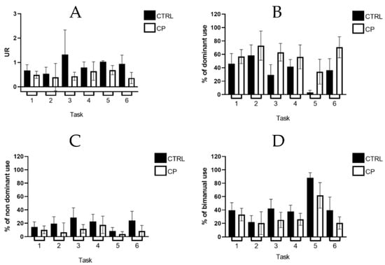 Mean and 95% confidence intervals of each metric by group and task. (A): Use ratio (UR). (B): percentage of dominant use; (C): percentage of non-dominant use; (D): percentage of bimanual use; Legend: CTRL = control group; CP = cerebral palsy group.