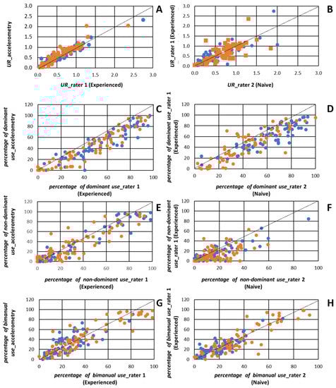 Graphical representation of association reported in Table 3: (A): Association between video-based use ratio (UR) Experienced; (B): Association between video-based UR of both raters; (C): Association between video-based and accelerometry-based percentage of dominant use; (D): Association between video-based percentage of dominant use of both raters; (E): Association between video-based and accelerometry-based % of non-dominant use; (F): Association between video-based percentage of non-dominant use of both raters); (G): Association between video-based and accelerometry-based percentage of bimanual use; (H): Association between percentage of bimanual use of both raters. Note that when data from a single rater is presented on a graph, data from rater 1 (experienced) is depicted, Legend: Blue dots= control group; Orange dots = cerebral palsy group.