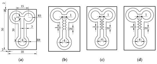 Schematic of the four different geometries: (a) straight, (b) zigzag, (c) cross-shaped, and (d) curved channels. Here, the zigzag, cross-shaped, and curved channels were designed with four pairs of constricted–expanded structures to produce the mixing effect. Here, the unit is mm.