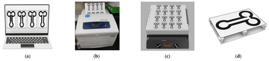 A schematic flowchart of the fabrication process is shown in Figure 2. We used Autodesk 123D to design the geometry of the μPADs (Figure 2a), and then printed them using a solid-wax ink printer (ColorQube 8570, XEROX, Tokyo, Japan) (Figure 2b). The patterns were wax printed on chromatography paper (No. 51A, TOYO ADVANTEC, Tokyo, Japan). Then, the μPADs were heated to 70 °C on a hotplate for 8–10 min until the wax fully penetrated the paper (Figure 2c). Finally, they were cut into individual paper-based chips for the experimental testing (Figure 2d).