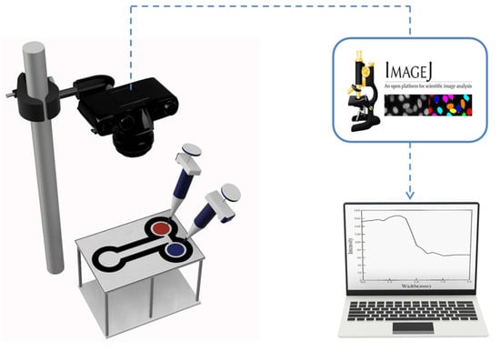 The experimental setup comprised a manipulation platform, polytetrafluoroethylene (PTFE) pipettes, and a digital camera (E-5P, Olympus, Tokyo, Japan), as is schematically shown in Figure 3. Each μPADs was placed on an upside-down heat sink to suspend the device in the air. This setup allowed the confluents to flow through the proposed channels without coming into contact with the tabletop. A digital camera was placed above the μPADs for monitoring purposes, and to record the mixing images. For the testing of such paper-based mixers, two water-based colored dyes were used to evaluate the mixing efficiency of the four proposed mixers. The acquired images were processed using ImageJ (v1.8.0, National Institutes of Health, Bethesda, MD, USA) to convert the colors red, green, and blue (RGB) into grayscale values. Finally, the mixing index was calculated by Equation (8) in order to evaluate the mixing performance.