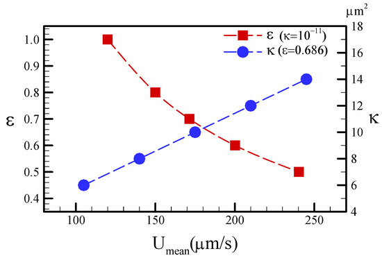 Mean velocity distributed against different porosities (ε) and permeabilities (κ).