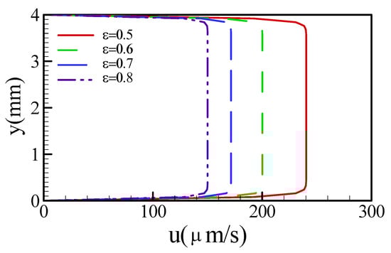 The velocity profile is important in the identification of the way in which a mixing phenomenon occurs. The velocity profiles against different porosities appear like a plug, which indicates a uniform streaming flow (Figure 5). A uniform streaming flow implies that transverse velocity did not occur, as it did in a previous study [18]. In other words, the mixing effect does not easily occur in the radial direction. Figure 5 also demonstrates that the mean velocity increases with decreasing porosity. In conclusion, porosity contributes to a uniform streaming flow, but it is not conducive to the radial advection effect.