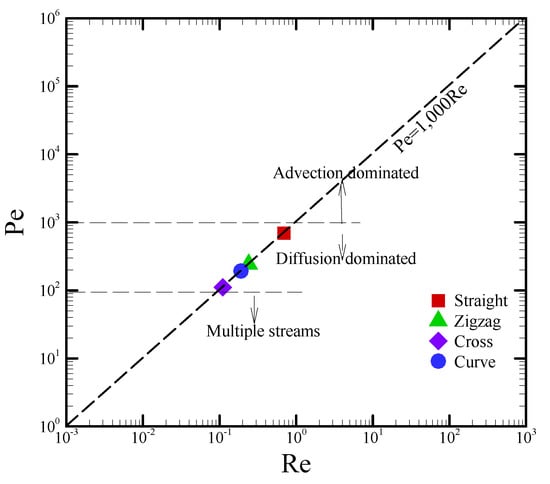 To date, effective mixing within microfluidic devices is still a challenging problem because of the low Reynolds number and uniform flow. For example, the diffusion time (τ) (~L2/D) is estimated to be approximately 4000 s, assuming a diffusion coefficient and mixing characteristic length of D = 10−9 m2 s−1 [3,28] and L = 2.0 mm (i.e., half width), respectively. The mixing time is apparently much longer than expected. Therefore, the promotion of mixing approaches is necessary in order to enhance the mixing effect for microfluidic systems. Herein, red and blue coloring dyes were dropped onto two inlets of a T-shaped junction. These two fluids were induced to flow through the channel via the capillary effect. The average flow times of the straight, zigzag, cross-shaped, and curved channels were measured as 144, 300, 410, and 331 s, respectively. The average velocities of the fluid were 173.6, 83.3, 61.0, and 75.5 μm/s with respect to the straight, zigzag, cross-shaped, and curved channels, respectively. The density, dynamic viscosity, and diffusivity of the solution were assumed to be 1000 kg/m3, 10−6 m2s−1, and 10−9 m2s−1, respectively. The paper-based microfluidic channel was designed to measure 25.0 mm in length and 4.0 mm in width. The characteristic mixing length (L) was defined as L = 4 AW/PW, where AW and PW denote the wetting area and the wetting perimeter of the flow, respectively. The characteristic mixing lengths were then calculated as 4.0, 2.91, 1.82, and 2.55 mm for the straight, zigzag, cross-shaped, and curved channels, respectively. The Reynolds number (Re = UL/ν) and Péclet number (Pe = UL/D) were subsequently converted, as plotted in Figure 6. In this work, the values of Re and Pe were apparently distributed in the range of 0.1–1.0 for the four differently shaped channels. The mixing mechanism belonged to the diffusion-dominated regime, as stated in the reference [3]. In other words, chaotic advection could not be externally induced to disturb the main flow, and the flow field was not conducive to a uniform mix.