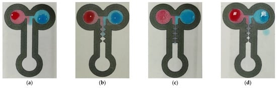 Most importantly, μPADs use intrinsic capillary force to transport fluids without integrating additional micropumps. However, one of the many challenges for μPADs is the development and effective design of mixing samples for reactions and/or detection. This issue presents difficulties because μPADs inherently exhibit a low Reynolds number and uniform flow regimes [18]. Therefore, μPADs should be developed such that they are sufficiently long to ensure adequate mixing. However, an increase in length results in an increase in analysis time. Moreover, fabricating 3D or complicated geometries and importing external forces onto paper-based substrates are difficult. Therefore, a number of studies have exerted great effort to develop paper-based mixers. Thus far, few µPADs have been proposed for application as mixers. For example, Green [27] developed a paper-based passive mixer that incorporates interrupting lines, i.e., rib bone structures, into a Y-shaped channel to successfully promote mixing performance. Rezk et al. [28] proposed paper-based active mixers that apply 30 MHz surface acoustic waves to channels in order to achieve homogenous mixing.