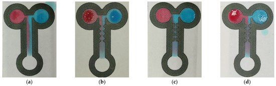 We verified the mixing performance of two different colored fluids using the method of color visualization. Red and blue dye droplets, each measuring 20.0 μL, were dropped onto the two inlets of the T-shaped channel. The dyes were slowly transported forward by the capillary effect. Figure 7 and Figure 8 show the concentration distributions for the four mixing channels at the dimensionless times of t* = 0.2 and t* = 1.0. A dimensionless time is defined as t* = t/τ, where t and τ represent the local flow time and the total time, respectively. The images show that the flow was initially laminar and stable because the red or blue coloring fluids were definitely separated near the T-shaped junction, i.e., in front of the first-pair constricted–expanded structure (Figure 7). When the fluids flowed through the zigzag, cross-shaped, and curved channels, significant mixing was observed because of the planar constricted–expanded geometries. As can be observed in Figure 8a, a slightly radial mixing effect occurred for the straight channel. On the contrary, this displayed the enhancement of the mixing performance behind the zigzag, cross-shaped, and curved constricted–expanded regions. As we expected, the purple color appeared obviously, as shown in Figure 8b–d. These results indicated that the three planar constricted–expanded structures—namely, the zigzag, cross-shaped, and curved channels—achieved the highest mixing performance.