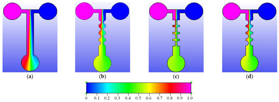 Numerical simulations were conducted in order to investigate the mechanism of the effect of the constricted–expanded structures on the concentration fields. The red and blue dyes were used to represent the initial concentrations of 1.0 and 0 mM, respectively. The green color indicated the completely mixed concentration of 0.5 mM. Figure 9 shows the concentration contours distributed along with the four different layouts of the passive mixers. Apparently, the concentration distribution of the numerical simulations was the same as that in the experimental observations. Initially, the two colored fluids were distinctly separated in front of the first-pair planar constricted–expanded region. For the straight channel, a slight mixing effect was noted in the central line of the channel, as shown in Figure 9a. However, the confluents achieved a reasonable mixing performance after the third-pair constricted–expanded structures for the zigzag and curved channels (Figure 9b,d), as well as after the second-pair planar constricted–expanded structure for the cross-shaped channel (Figure 9c). In sum, the fluids flowed through the three different four-pair planar constricted–expanded structures relative to the straight channel. Thus, enhanced mixing performance was achieved, particularly in the cross-shaped channel.