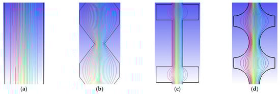 In principle, if streaming is parallel to the main flow direction, then it is not useful for the transversal mixing process. Thus, chaotic advection needs to be introduced to the main flow in order to significantly improve the mixing performance. The streamlines are parallel to one another, such that the mixing effect is dominated by the effect of molecular diffusivity, as shown in Figure 10a. However, as the fluids flowed through the three planar constricted–expanded structures, significant curved streamlines occurred, as shown in Figure 10b–d.