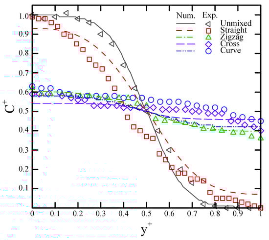 Comparison of the numerical and experimental data in terms of the dimensionless concentration distributions of the four mixers.
