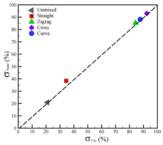 Thus, we calculated the mixing index based on Figure 11 and Equation (8) in order to evaluate the mixing efficiency. The experimental results showed that the mixing index increased from 20.1% (unmixed) to 34.5%, 92.4%, 87.3%, and 84.3% with respect to the straight, cross-shaped, curved, and zigzag channels, respectively. Similarly, the numerical calculations revealed that the mixing index increased from 21.1% (unmixed) to 38.3%, 93.0%, 88.2%, and 85.3% with respect to the straight, cross-shaped, curved, and zigzag channels, respectively. These results showed that the constricted–expanded structures—i.e., the zigzag, curved, and cross-shaped channels—can achieve a good mixing performance. The relationships between the mixing index and the four mixing channels were also explored herein, and the results are shown in Figure 12. The numerical data were deemed completely consistent with the experimental data when located on the dashed line. Under the dashed line, the numerical mixing index was deemed to be higher than the experimental one. When above the dash line, the numerical mixing index was deemed to be lower than the experimental one. In these results, the variation of the mixing index in the numerical simulations relative to the experimental measurements was slightly higher in the range of 1.0–11.0%.