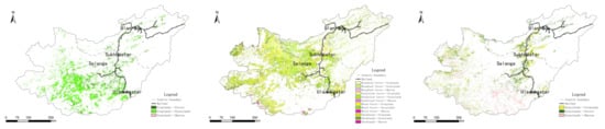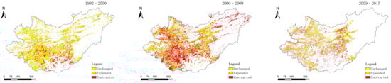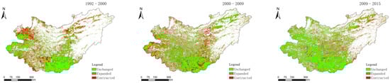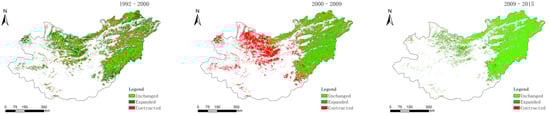 Three land-use change layers (1992–2000, 2000–2009, and 2009–2015) were made from cultivated land, coniferous forest land and grassland (Figure 2, Figure 3 and Figure 4).