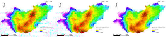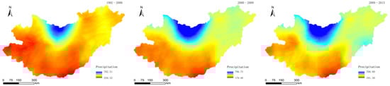Through ANUSPLIN, the raster data layers of the precipitation (Figure 7) and average temperatures (Figure 8) in 1992–2000, 2000–2009, and 2009–2015 were obtained.