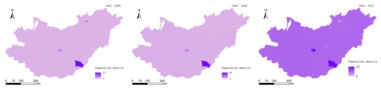 According to the official statistics of NASA, raster data of the world population in 1990, 2000, 2010, and 2015 were obtained, and raster layers of population density changes in the basin in 1992–2000, 2000–2009, and 2009–2015 were obtained (Figure 9).