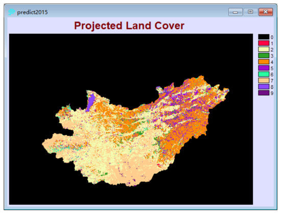 Based on the land use distribution map in 2000, combined with the 2000–2009 land use type transition matrix and suitability atlas, the time span is six years, and the land use distribution in 2015 is simulated and predicted, and the prediction results (Figure 11) Compared with the actual land use distribution map in 2015, the Kappa coefficient is 0.76. Due to the long simulation period and changes in the objective natural environment and economic and social conditions, the simulation effect of this experiment is good and credible.