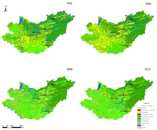 Land use/cover map of the Selenga River basin in 1992, 2000, 2009 and 2015.