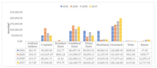 Through the overlay analysis of land use data in 1992 and 2015, the land transfer matrix is obtained (Table 5). From 1992 to 2015, cropland was converted to forest and grassland, some of which were converted to barren; broadleaf forest, needleleaf forest, mixed forest, and shrubland were weakly converted to grassland at the same time; grassland was partially converted barren and forest; barren occupies a small proportion, which focuses on the transformation of grassland, forest, and cropland.