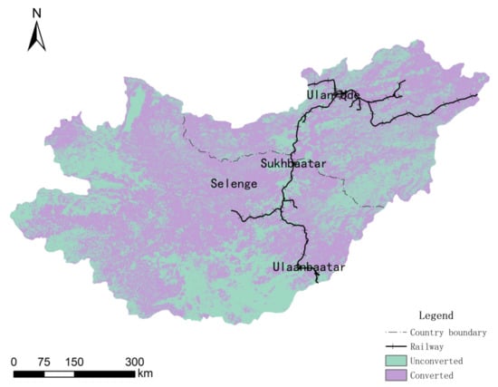 The areas where grassland was converted to forest were mostly distributed in northwestern Mongolia and the central and southern regions of the Republic of Buryatia, Russia, with significant changes along the railway. In the city of Sukhbaatar in northern Mongolia, some grasslands were converted into cultivated land. In the central and northwestern parts of Mongolia, grassland was mostly transformed into bare land (Figure 15).