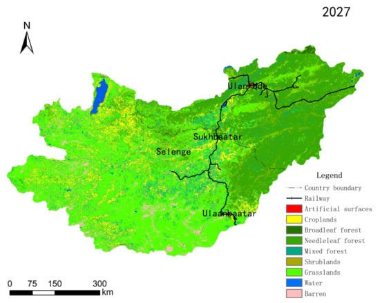Broad-leaved forest, coniferous forest, mixed forest, and shrubland shifted, and the conversion of forestland to grassland was mainly distributed in northern Mongolia, while the conversion of forest land to bare land mainly occurred in western and central Mongolia. The conversion of shrubland to grassland mostly occurred in central Mongolia and along the railway; the conversion of mixed forest land to grassland was mostly concentrated in northern Mongolia and along the railway line; and the conversion of coniferous forest land to grassland was distributed in northern and eastern Mongolia.