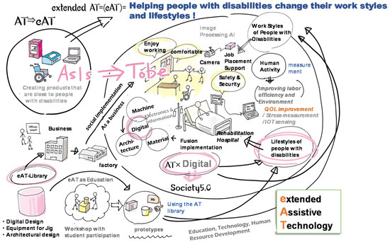 In Japan, the National Institute of Technology (KOSEN) started its latest research project, called GEAR 5.0, in May 2020. AT and medical engineering are key disciplines selected as the focus of the GEAR 5.0 project. This project aims to realize the next-generation AT (extended-AT (eAT)) that combines AT and digital technologies (AI, IoT, robotics, big data, and mobility, etc.) to realize Society 5.0. Here, “Society 5.0” refers to Japan’s 5th Science and Technology Basic Plan, which refers to an ultra-smart society that utilizes digital technologies such as IoT and AI that integrate cyber and physical space.