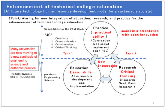 Figure 2 shows the concept of the advancement of technical college engineer education in this GEAR 5.0 project (nursing care and medical engineering fields). In the field of AT, we aim for a new integration of education, research, and practice for the development of technical college education. In other words, we will practice the fusion of education, research, and social implementation that is being promoted at many universities. AT has so far focused on the production of assistive devices to overcome or complement disabilities. In the next generation, however, it will be essential to have a good understanding of people with disabilities when developing high-mix, low-volume assistive devices for various disabilities using digital technology. Therefore, this is a gap market where no major companies have been able to enter. Until now, the technical colleges collaborating in the nationwide KOSEN-AT network have been working individually with local special-needs schools, NPOs in Japan, and medical institutions to develop and research assistive devices.