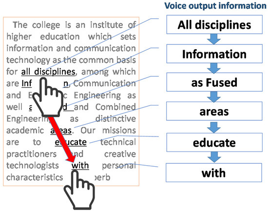 The following tablet terminal applications have been developed for use by the blind and elderly who cannot use braille. AccessNote for the iOS platform is designed particularly for VoiceOver users looking for an efficient, feature-rich note-taking experience. An inexpensive alternative to traditional note-takers, it allows users to combine efficient note-taking with the other features and functions of the iOS devices, making it accessible to blind and visually impaired people [17]. AccessWorld has also been optimized for iOS VoiceOver and accessibility features. Amazon Kindle allows users to use their iPhones and iPads as a Kindle device and access their e-books purchased from Amazon as well as download e-books directly to their devices [17]. However, with Amazon Kindle, visually impaired users have a hard time finding the part they want to read because the text is read aloud from the beginning of the document. The environment for ICT-assisted reading support described above is not sufficient for the visually impaired, especially those with intermediate visual impairment. For this reason, there is an urgent need to develop assistive devices based on Society 5.0 that can be used with an understanding of the situation of users with disabilities. Especially for the visually impaired, retrieving the necessary information from a vast amount of information is a very important task for users who listen from voice output devices.