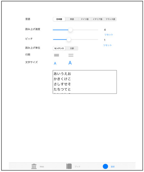 Screenshot of settings and contents in “Touch Talker”. The example screen in Figure 4 shows the Touch Talker settings menu. From the top, it shows “Language Selection”, “Reading Speed”, “Pitch (character spacing)”, “Reading Unit–Sentence or Section”, and “Font Size”. In addition, the rectangle at the bottom is an example of a sentence display.