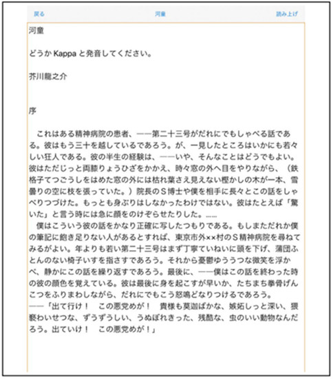 Using a smart device, start the “Trace Reading” application. Trace the file list in the text folder from top to bottom, and VoiceOver will read out the individual file titles. Next, open the text document that you want to read by selecting the text file you want to read. Begin reading by tracing from above with your index finger. The text document you want to read can also be added or deleted as a text file or PDF file from “iTunes” or “folder”. Table 1 and Figure 4 show the list of settings and screenshots for “Touch Talker”. In the setting mode, the user can set each language (Japanese, English, German, Italian, French), reading speed, pitch, reading units, (sentences, clauses), line spacing, font size, etc., according to the user’s preference. Depending on the size of the user’s hands and their senses, there are different settings for font size and line spacing according to their preference. This system uses text-to-speech software to read out the settings and allow the user to change the settings, but in this case, we used the default settings that the subjects had practiced with before the experiment, and set them all to the same settings. Here, I used a font size of 28 points, a line spacing of 5 points, and a reading speed of 5 (middle speed). Figure 5 shows a screenshot of the loaded text document. After booting up the system, the user uses their index finger to trace down from the top of the screen to read the word closest to their fingertip. When the user’s index finger reaches the bottom of the screen, a double-tap with the index and middle fingers brings up the next page (this is a type of gesture control).