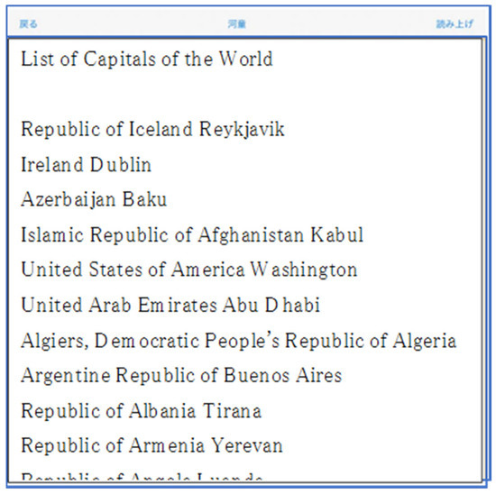 For the evaluation experiment, we prepared a task of retrieving arbitrary information from a huge amount of information. As shown in Figure 6, we also created a text file with 190 countries and their capitals, one on each line. The prepared text file was then loaded into the developed “Touch Talker” system, as shown in Figure 6. In this experiment, the specifications of the initial system settings in Table 1 were set as follows: