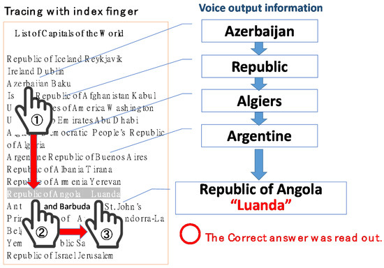 Figure 7 shows the flow of capital search by tracing with your index finger. Using a smart device, launch the “Trace and Read” application. When the user traces their index finger down from the top of the iPad screen, the name of the country at their fingertip will be read out by the iPad’s VoiceOver function. Then, moving the user’s finger to the right will read out the capital of the country, as shown in Figure 7.