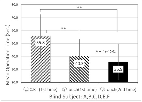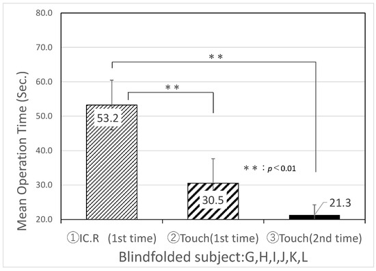 Table 4 and Figure 8 show the experimental results of the average search time and standard deviation of IC.R and “Touch Talker” for the first trial of Task 1, Task 2, and the second trial of Task 3 by six visually impaired people. Table 5 and Figure 9 show the experimental results of the mean search time and standard deviation for six blindfolded technical college students simulating intermediate visual impairment. From the comparison of Table 4 and Table 5, there was no significant difference in the mean search time using the digital IC recorder between the visually impaired group and the blindfolded group of students, which were recorded as 55.8 and 53.2 s, respectively (a p-value less than 0.01 s was considered statistically significant). The developed “Touch Talker”, on the other hand, reduced the mean search time for both the visually impaired people and blindfolded, healthy people when compared to the digital IC recorder. Furthermore, when compared to the first trials of Task 1 and Task 2, the average search time for both groups of “Touch Talker” became shorter in Task 3, the second trial, as they became more familiar with the operation of the device. According to the results of this experiment, the standard deviation for each individual decreased.