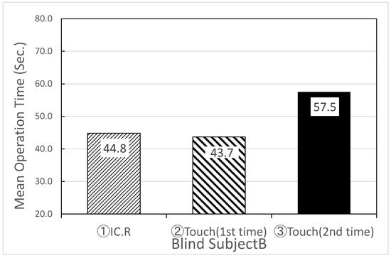 Rather, the second trial of “Touch Talker” tended to take more time as shown in Figure 10. Subject B is a 30-year-old blind female, as shown in Table 2. She usually uses most of the information terminals, including a smartphone. Therefore, she is familiar with information terminals. In the questionnaire after the experiment, she commented on the operation of “Touch Talker” as follows: