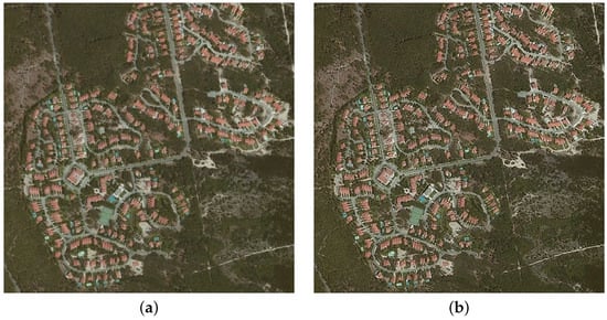 for , P is a panchromatic image, I is a linear combination of a low-resolution multispectral image, N indicates the number of bands covering the spectral signature of the panchromatic image,  denotes covariance between the X and Y images, and  is a variance of image X. The band coefficients are determined in accordance with the AIHS approach (Adaptive Intensity-Hue-Saturation) [], which achieves good results in this issue.